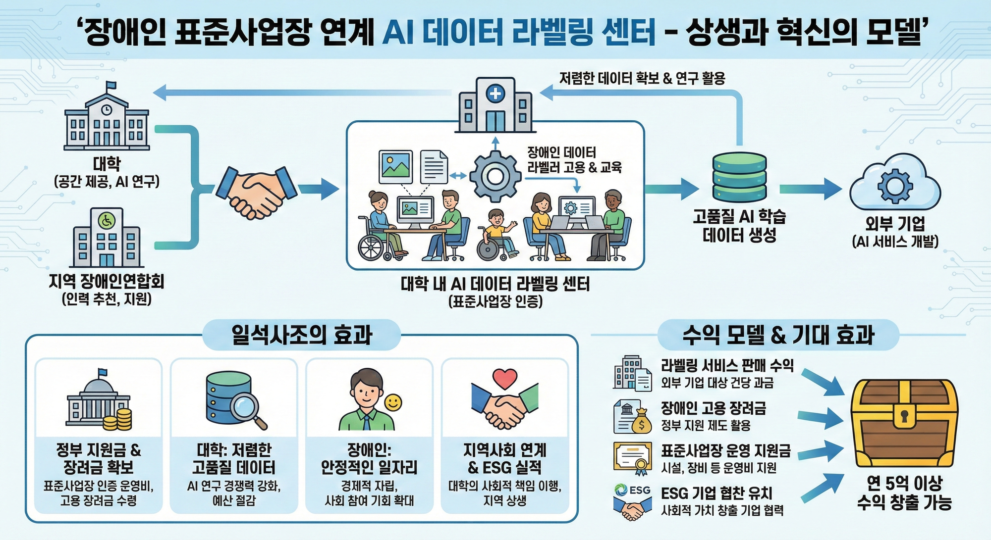 대학 내에 AI 데이터 라벨링 센터를 만들고, 지역 장애인연합회랑 협업해서 장애인 분들을 데이터 라벨러로 고용하는 거예요.
