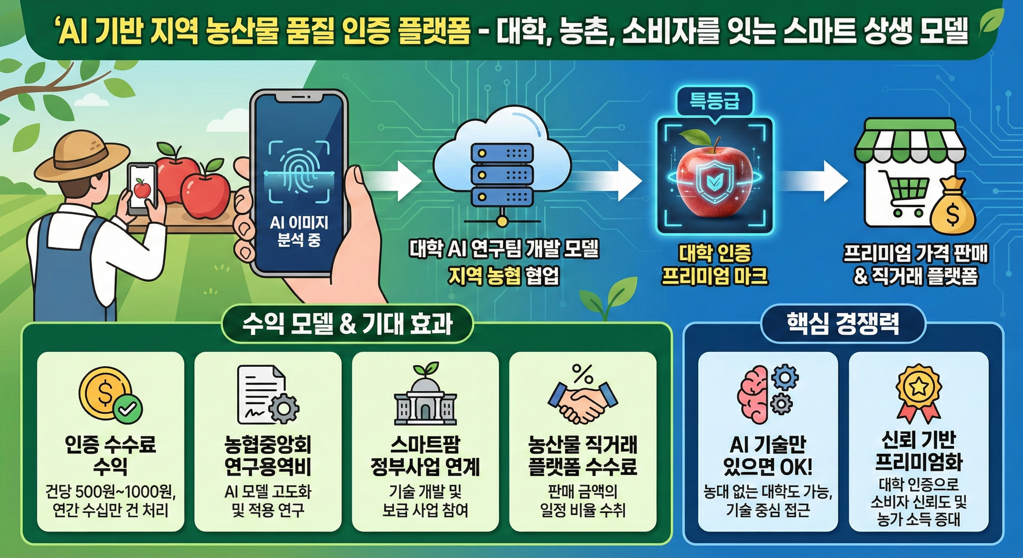 농민들이 스마트폰으로 사진만 찍으면 AI가 등급 판정해주고, 대학 인증 마크 붙여서 프리미엄 가격에 판매하는 시스템!