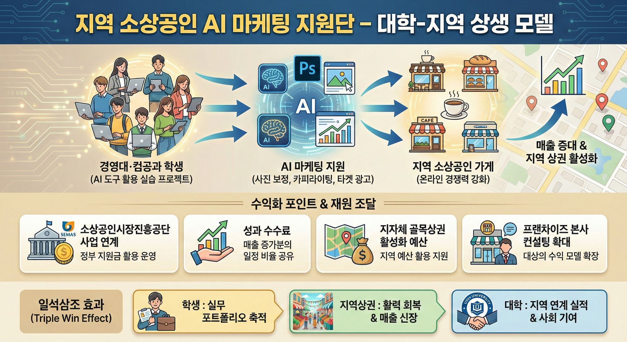 학생들은 포트폴리오 쌓고, 지역상권은 살아나고, 대학은 지역연계 실적 쌓고. 완벽하죠?