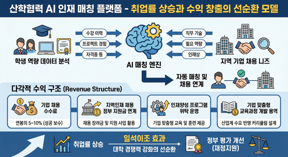 학생들 역량 데이터(수강 이력, 프로젝트 경험, 자격증 등)를 AI로 분석해서 지역 기업 채용 니즈랑 자동 매칭해주는 거예요.